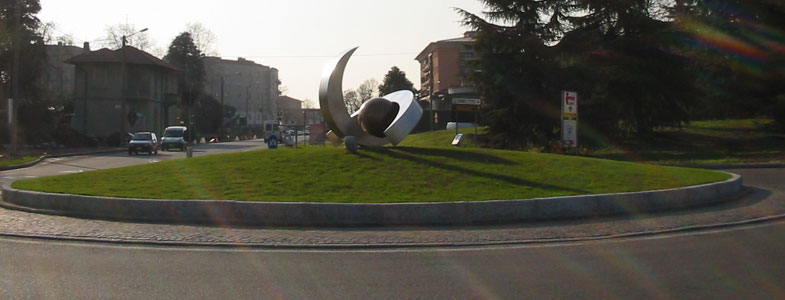 Ho dovuto tener conto della forma circolare su cui si posa, traendone così una sfera, chiaro simbolo del nostro pianeta, del sole e dalla perfezione che gli si addice da secoli in ogni forma d'arte, a questo ho aggiunto le lune, una orizzontale , più terrena a spicchio, prima crescente verso il centro e poi decrescente verso la fine, quasi a rappresentare l'impostazione e il modo sicuro di affrontare la curva.